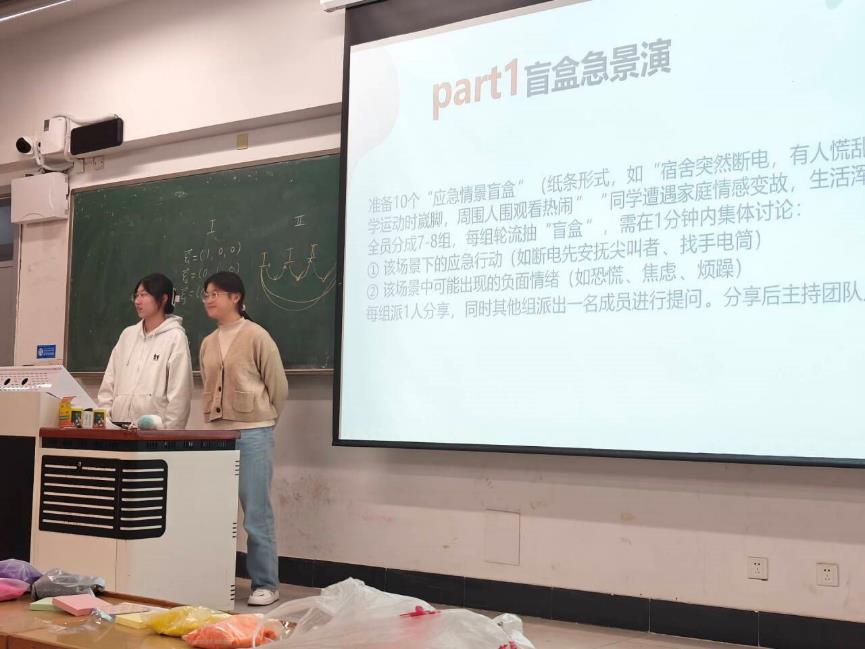为有效缓解大学生学业压力,提升学生心理适应与情绪调节能力,近日,应急管理学院在厚学楼409教室组织开展了“盲盒演急景,瓶语释心忧”心理主题活动。本次活动将情景模拟与情绪表达相结合,以生动有趣的形式引导学生关注心理健康,积极应对压力。