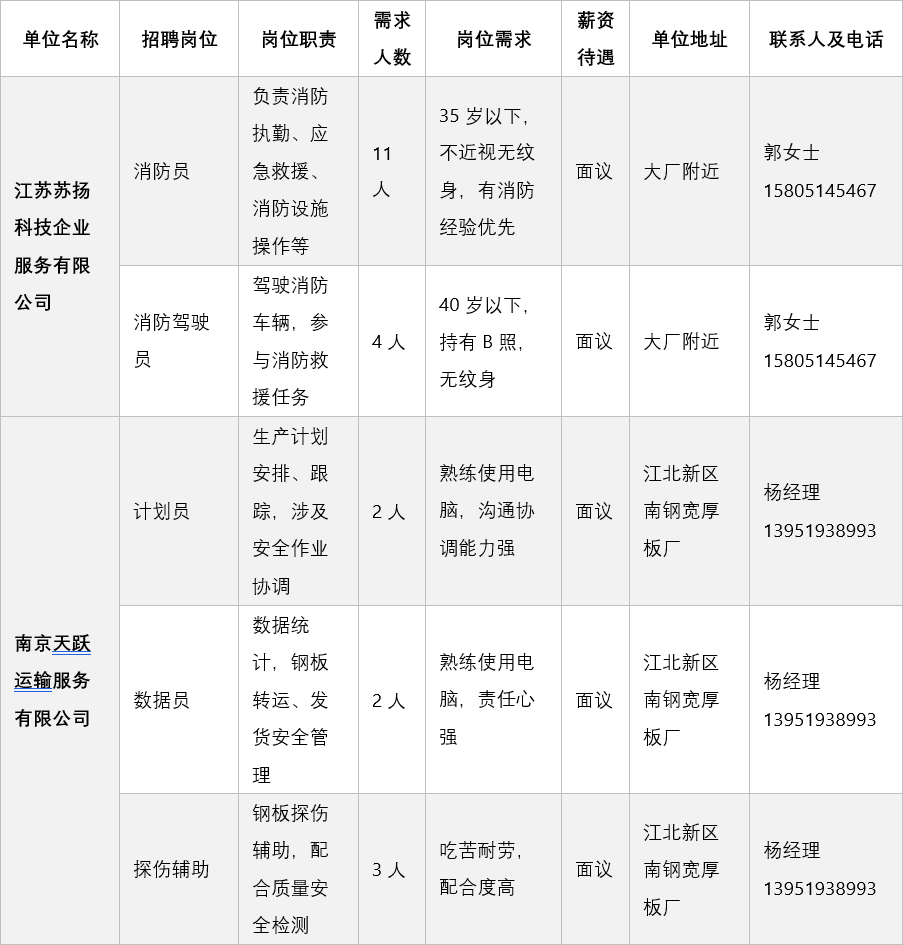 本次苏扬科技面向应急管理及相关专业毕业生招聘的岗位包括:消防员、消防驾驶员、危化品装卸操作工和零工市场开发专员。所有岗位均提供五险一金,工作地点主要在大厂附近及六合化工园。